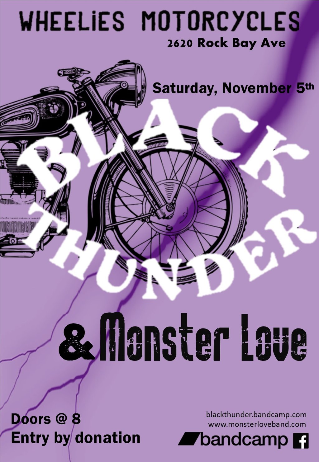 Set the date for a cacophany of rock on November 5th! Two hard hitting bands, Black Thunder and Monster Love, are set to play in one of Victoria's coolest venues, Wheelies Motorcycle Bar. This is a great opportunity to see both bands up close and personal in a stylish setting. Don't have a ton of cash to spare? That's ok, entry is by donation.