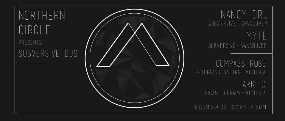 CFUV 101.9 FM's Northern Circle is very excited to be moving things off the airwaves and into a venue for another night of deep beats and dancing. We are excited to present DJ sets by the Subversive DJs Nancy Dru & Myte (Vancouver) with local support from Compass Rose and Arktic, with Emp Interactions setting the tone visually for the night.