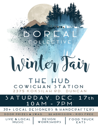 We are very excited to bring you the Boreal Collective Winter Fair 2016, an modern showcase of 40 unique local makers and designers from around Vancouver Island... a fantastic cross-section of talented creatives, innovative designers and makers, delicious food and unique workshops that will take place in the Cowichan Valley in a seasonal event that is sure to be the best show in the valley.