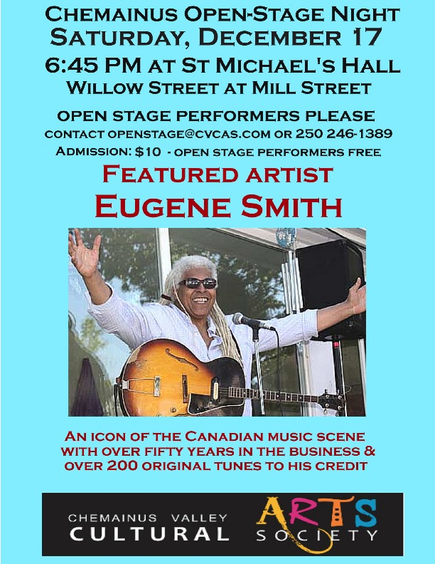 The monthly Chemainus Open-Mic and Concert event will feature Eugene Smith as the main, featured performer. Eugene Smith is an icon of the Canadian music scene, with more than fifty years in the business and over 200 original tunes to his credit. The Eugene Smith concert will follow the regular "open-mic" performances during the first half of the show.