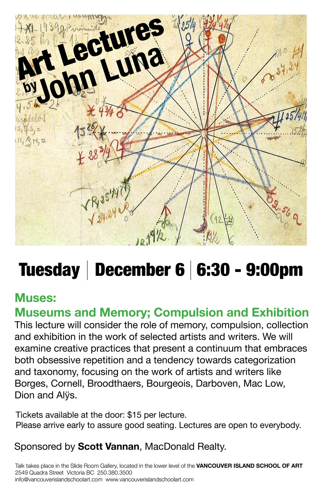 This Lecture will consider the role of memory, compulsion, collection and exhibition in the work for selected artists and writers. We will examine creative practices that present a continuum that embraces both obsessive repetition and a tendency towards categorization and taxonomy, focusing on the work of artists and writers like Borges, Cornell, Broothaers, Bourgeois, Darboven, Mac Low, Dion and Alys.