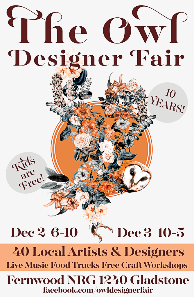 The Owl Designer Fair is the most creative holiday marked in Victoria. 40 local vendors of hand made gifts, food trucks, free craft workshops and full live music lineup of local singer songwriters.