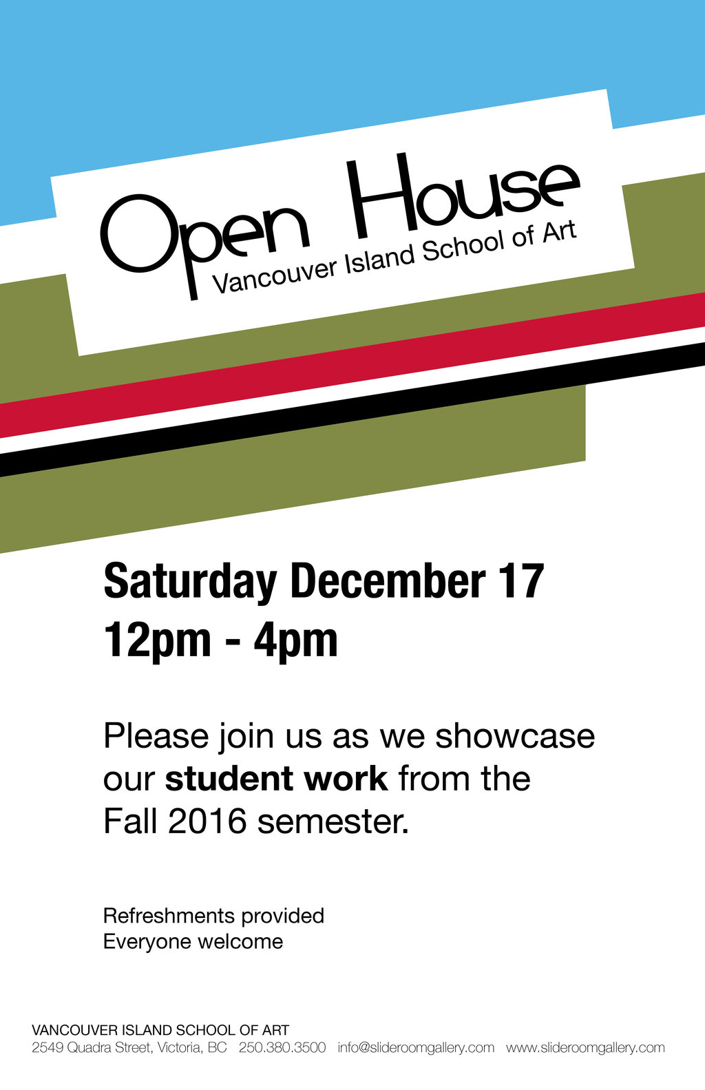 VISA will be covered from top to bottom with student art work from the fall 2016 semester! This is a great opportunity for students to bring family and friends to see what they have been creating. If you are considering taking a course at VISA this will give you a sneak preview of what happens inside the class room. Also, our third-year students will be in their studios happy to talk about what they have been working on in their final year!