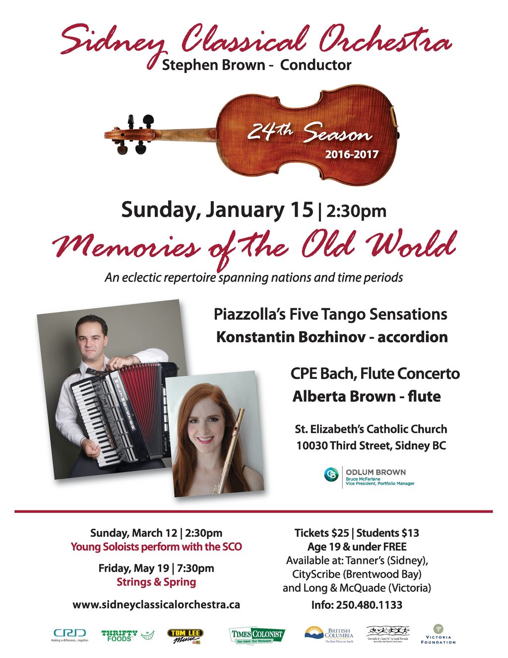 The Sidney Classical Orchestra welcomes soloists Konstantin Bozhinov (accordion) and Alberta Brown (flute) in an eclectic repertoire spanning nations and time periods, featuring Piazzolla’s Five Tango Sensations for accordion and string orchestra, and Vivaldi’s “La tempesta di Mare” flute concerto.