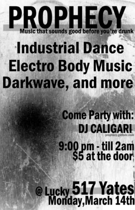 Prophecy's DJ Caligari spins the best in EBM (EBM = Electronic Body Music but some still call it Industrial Dance. EBM's roots lay in early Electro and Industrial, but the sound has changed drastically and now spans Industrial style bass pounding grooves to