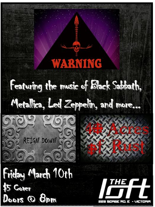 Warning is Vancouver Islands Black Sabbath band, formed in 2016 we play classic Sabbath from Warpigs and Electric Funeral to Lord of this World, live! These guys have played at Lucky Bar, My Bar, and The Loft before and had the crows rockin' out all night
