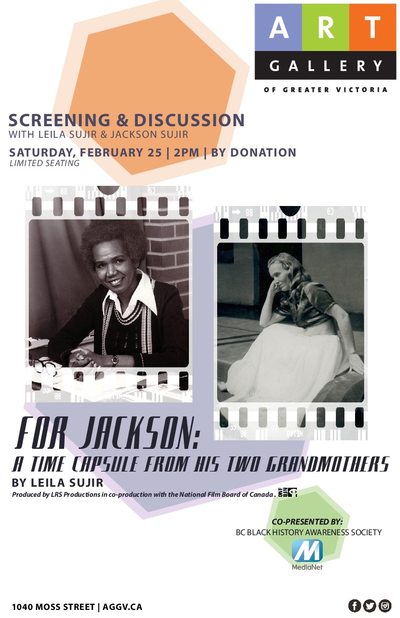 The AGGV in collaboration with the BC Black History Awareness Society and MediaNet present FOR JACKSON: A TIME CAPSULE FROM HIS TWO GRANDMOTHERS (2004; 49 mins) by Leila Sujir. Screening to be followed by Q&A and discussion with the artist, Leila Sujir, and her nephew Jackson Sujir, to whom the film is dedicated.