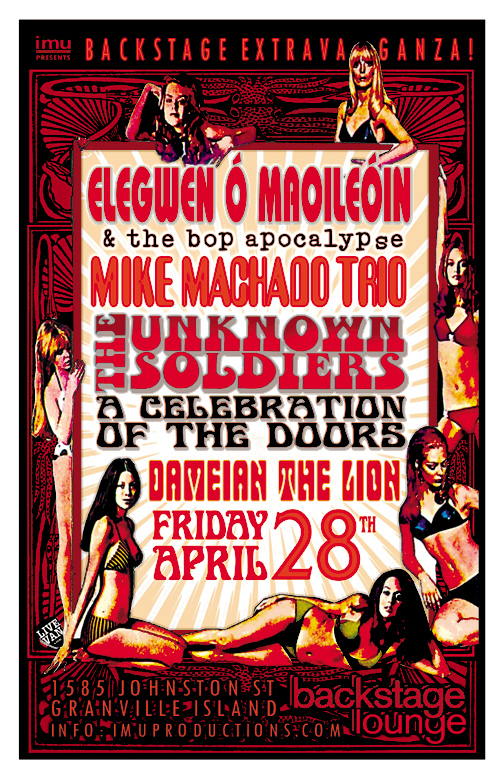 . Friday, April 28th IMU presents BACKSTAGE EXTRAVAGANZA featuring The BOP APOCALYPSE, MIKE MACHADO TRIO, The UNKNOWN SOLDIERS A Celebration Of The Doors & DAMEIAN THE LION @ The Backstage Lounge, 1585 Johnston St., Granville Island. Doors 9pm / Show 9:30pm / $10 adv tix . $12 at the door