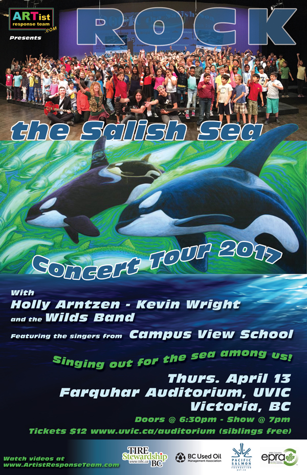 The Artist Response Team (ART) presents the Rock The Salish Sea! Tour 2017, travelling to seven communities and watersheds around the Strait of Georgia and Puget Sound. The Victoria concert features Holly Arntzen and Kevin Wright and the Wilds Band, performing with 400 students from Campus View Elementary school, singing original eco-rock songs about ocean and watershed stewardship, wild salmon and climate change. Students have been learning songs for months, getting ready to blow the roof off of the Farquhar Auditorium! Arntzen and Wright lead a 4-day artist in residence music program at Campus View school. Their mission is to inspire the citizens of BC and Washington state to take action to protect the Salish Sea and its ecosystems and wildlife, and..."keep singin' songs about the Salish Sea!"