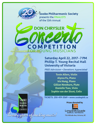 The Sooke Philharmonic's next event is our 12th Annual Don Chrysler Concerto Competition for Young Musicians, coming up on Saturday April 22 at 7:00 PM.