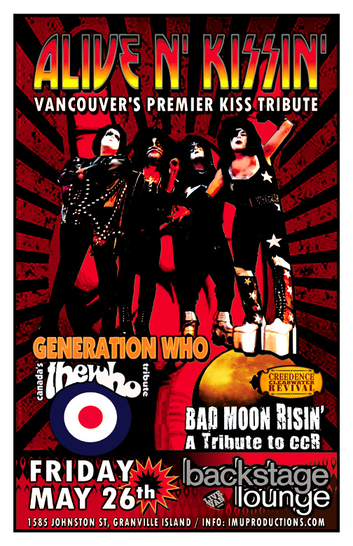 . Friday, May 26th IMU presents ALIVE N KISSIN' (Kiss Tribute), GENERATION WHO Canada's Who Tribute & BAD MOON RISIN' CCR Tribute @ The Backstage Lounge, 1585 Johnston Street. Doors 9pm / Show 9:30pm / $10 cover