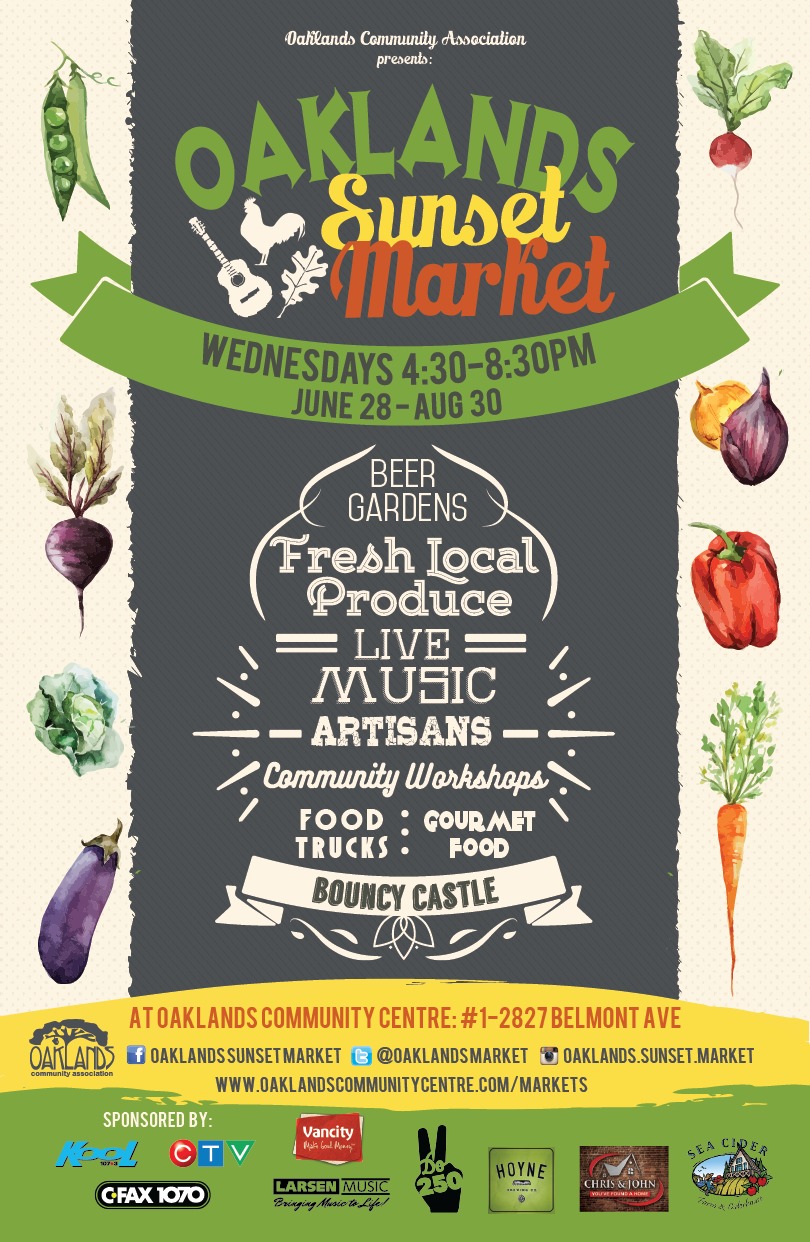The Oaklands Sunset Market returns on June 28th, 2017 and runs every Wednesday from 4:30pm to 8:30pm until August 30th at the Oaklands Community Centre. The Market is a free, weekly community celebration featuring over 50 local food growers and producers, artisans, crafters, and body products, live music, a bi-weekly beer garden, and a space for the community to come together and meet their neighbours.
