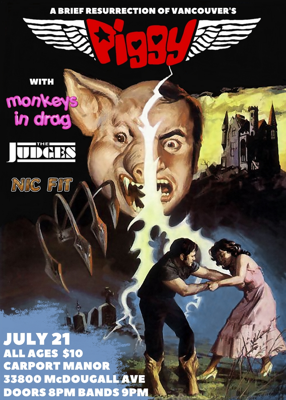 May 6th 2016 Piggy (official BAND PAGE) played what was to be their final show and what a great show it was! one year later (to the day) and without warning, the powerhouse announced that ol' 3 Beer Ronnie wants nothing more for his birthday than one more romp in the sty with the finest sounder of the swine line ups ... so on Friday July 21 at Carport Manor in Abby and Saturday July 22 at Pub 340 in Vancouver Ron, Craig, Lisafurr and Ms Izzy take to the stage to rock n roll through the mud, blood and riffs one last time!