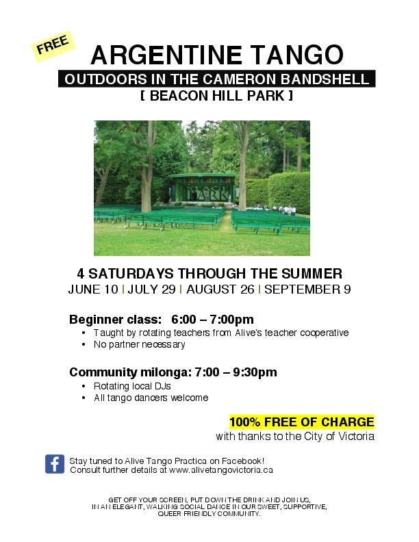 Join a FREE Argentine Tango Beginner Class in Beacon Hill Park, Saturday June 10, 6:00 - 7:00pm