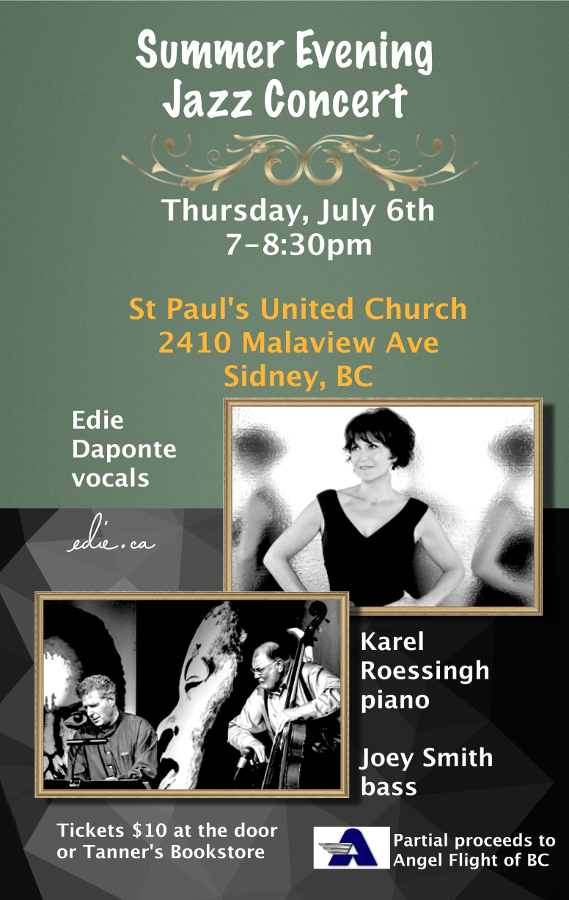 A summer evening concert featuring local singer Edie Daponte with Karel Roessingh on piano and Joey Smith on bass.
