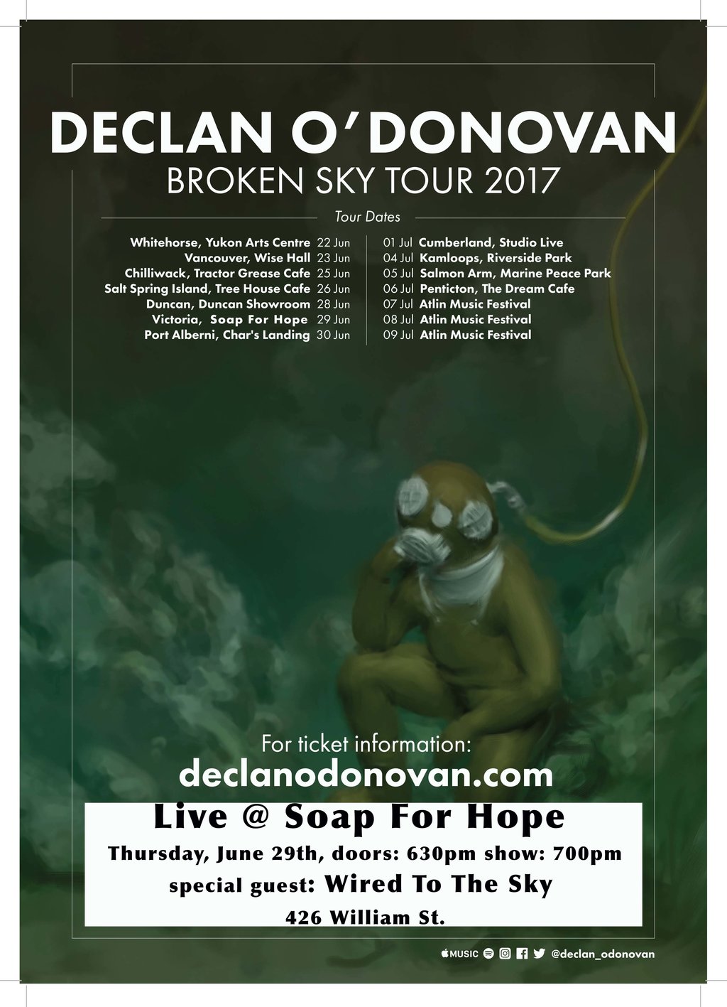 Declan is touring nationally and internationally in support of Broken Sky. In 2017, he is booked to play in Germany in March and May; at Fuji Rock Festival in Japan in July; and will be in Canada during the summer of 2017. He will appear at Canadian Music Week (Toronto), the Atlin Arts & Music Festival and will tour BC in July.