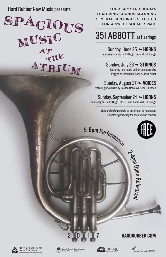 The Hard Rubber New Music Society presents Horns at the Atrium, the first of a series of free concerts featuring music selected and commissioned for the reverberant interior courtyard at Woodward’s (Hastings and Abbott) on four Sundays, June to September. Each program will feature spacious sounds spanning several centuries focused on a particular instrument, held at 5 pm, preceded by an open rehearsal at 2-4 pm.