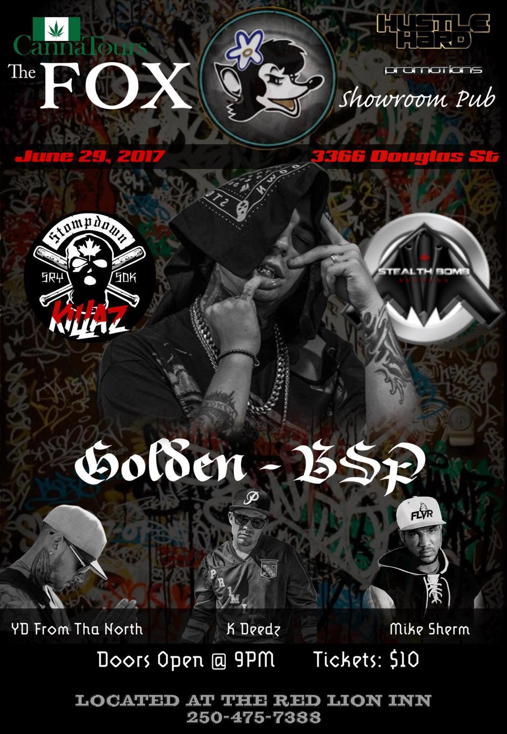 Hustle Hard Promotions, Cannatours & The Fox presents: Stompdown and Stealthbomb recording artist GOLDEN BSP feat. YD from THE NORTH, MIKE SHERM, and K-DEEDZ