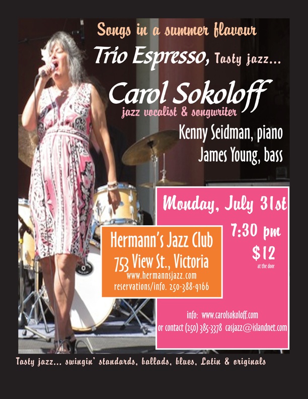 Jazz vocalist and songwriter Carol Sokoloff presents 'Songs in a Summer Flavour', an evening of tasty jazz with the swinging vocal/piano/bass Trio Espresso, featuring jazz standards, both well-known and obscure, as well as original songs for a romantic summer night. Known for her warm voice, thoughtful approach to standards and remarkable original songs with the sound of the standards, vocalist Carol Sokoloff appears with the very swinging Kenny Seidman on piano and the dynamic James Young on upright bass.