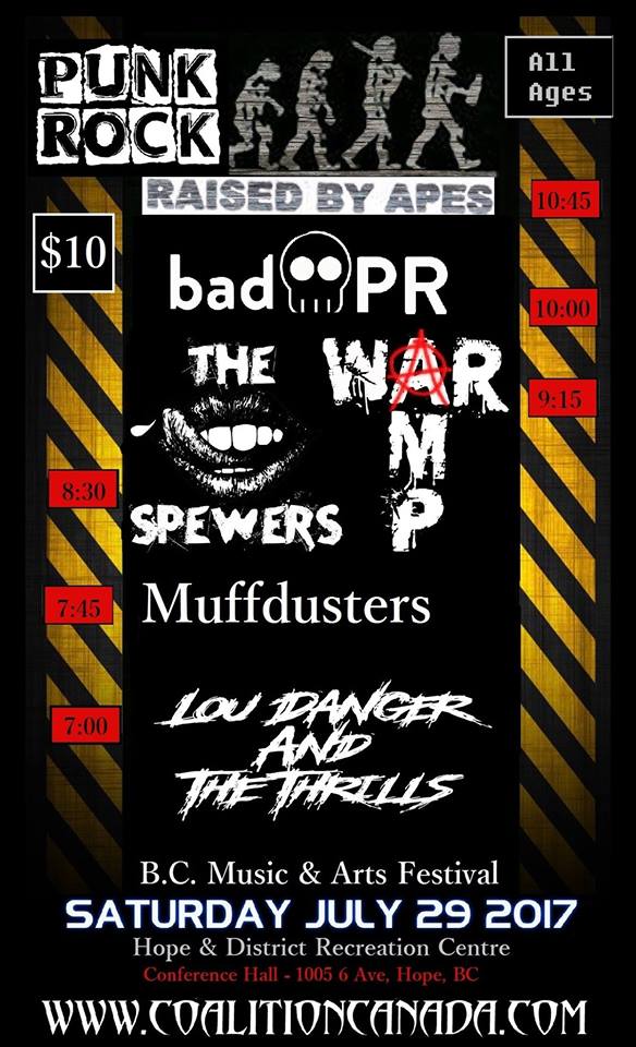 ALL AGES PUNK ROCK: Raised By Apes, Bad PR, War Amp , Spewers, Muffdusters, Lou Danger & The Thrills @ Hope Rec Center Jul 29 2017 - Feb 18th @ Hope Rec Center