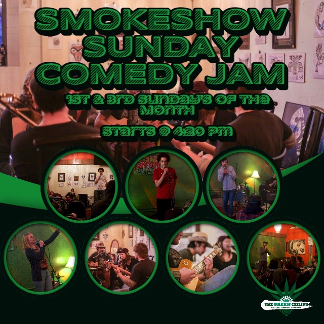 Come join your friends at The Green Ceiling for the funnest way to spend a Sunday. We get started at 4:20 with a smokeout and an open music jam featuring the Spliff Personalities, so bring your instruments down and join in on the fun! Then we've got an open mic comedy show starting at 6:00 so bring your best jokes and laugh away the evening!