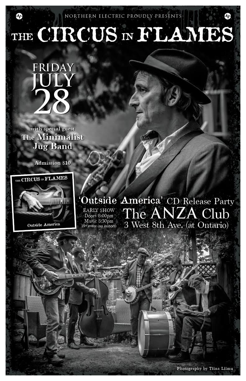 On Friday, July 28, 2017, Northern Electric proudly presents The Circus In Flames CD Release Party for Outside America at the Anza Club (Mt. Pleasant Hall) 3 West 8th Ave. at Ontario St. in Vancouver. The Circus In Flames will perform their "original garage string band music of the Canadian south" with songs from their latest recording, Outside America as well as some of their old, original favourites. Special guest is The Minimalist Jug Band. This will be an early show: