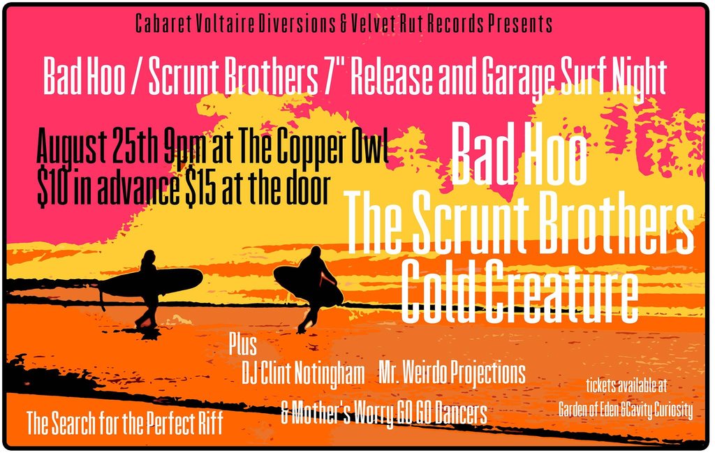 A night of modern Garage Surf Rock...and the celebratory release of the much-anticipated Bad Hoo / Scrunt Brothers split 7" vinyl (VRR007).
