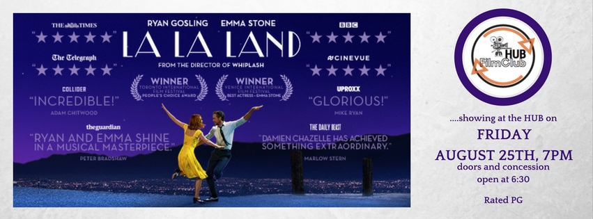 It's time for some summer musical fun at the HUB with the movie La La Land! See it again or catch it for the first time. This almost-best picture multi-Oscar winner stars Emma Stone and Ryan Gosling in a story of a jazz pianist who falls for an aspiring actress in a very colourful Los Angeles. Directed by Damien Chazelle, rated PG. USA 2016.