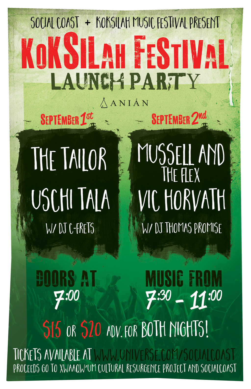 Come get warmed up for the Koksilah Festival and enjoy 2 nights of music at ANIÁN featuring The Tailor, Uschi Tala, Scott Dunbar, Mussell and the Flex, Vic Horvath and more! Proceeds from these events will be shared between the Xwaaqw’um cultural resurgence project and SocialCoast.