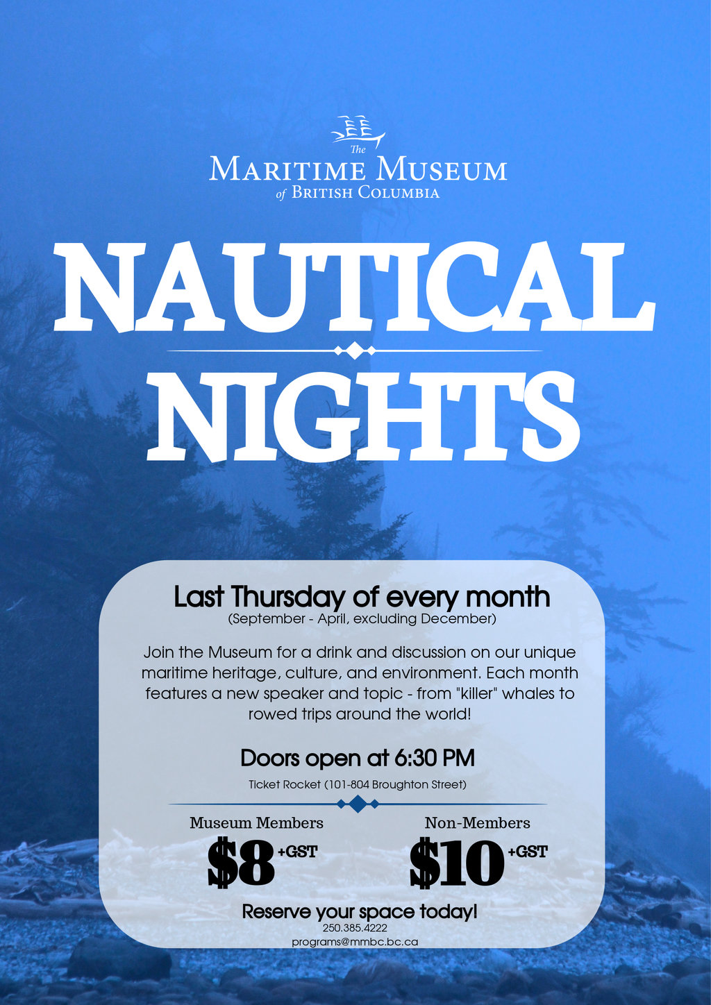 Join the Maritime Museum of BC for a drink and discussion on our unique maritime heritage, culture, and environment. Each month features a new speaker and topic - from "killer" whales to rowed trips around the world!