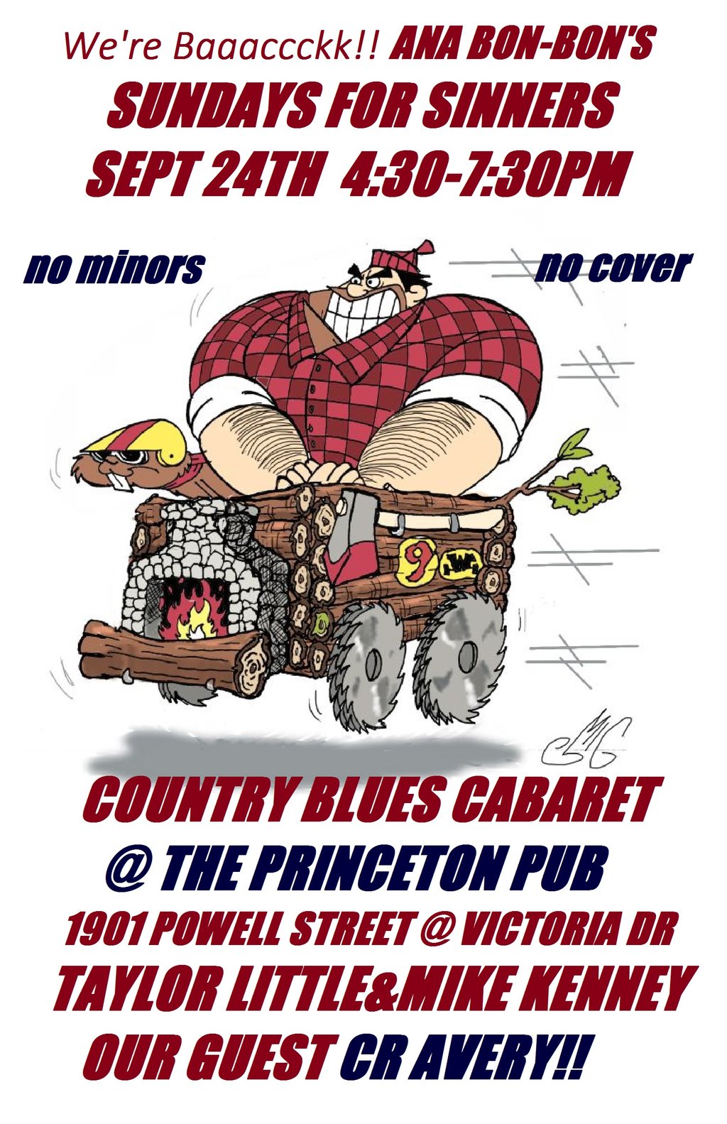 Sundays for Sinners is back at the Princeton Pub on Powell St at Victoria Drive in Vancouver, in East Van's brewery district. Featuring rock star drummer Taylor Little and the slick and smooth Mike Kenney on guitar- in a trio with Ana Bon-Bon's country-fried blues and rhythm accordion and evocative vocals. Free entry, great craft brews, pub food, pool table, and friendly people in the best little local down by the railway tracks and old docks, in the area once known as 'Cedar Cove'. Now we play music and watch the trains go by the windows in the most relaxed atmosphere! NO Minors. NO Cover! 4:30-7:30 pm ... With our wonderful special guest- international troubadour CR AVERY. See you soon at the "Prinny"!