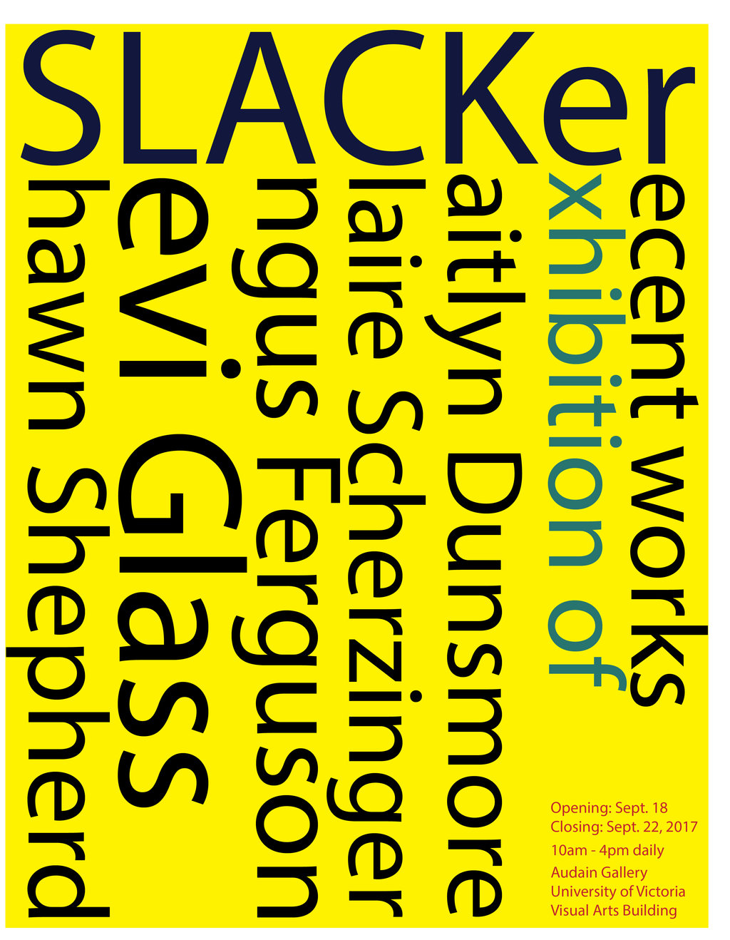 SLACKER: Shawn Shepherd, Levi Glass, Angus Ferguson, Claire Scherzinger, Kaitlyn Dunsmore @ Audain Gallery, University of Victoria Sep 18 2017 - Jan 14th @ Audain Gallery, University of Victoria