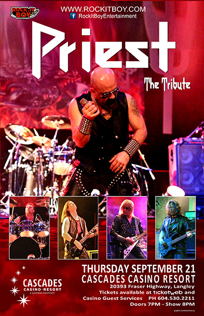 PRIEST THE TRIBUTE delivers an authentic Judas Priest experience. With Alex as Rob Halford, Floe as Scott Travis, Shane as Ian Hill, Ken as KK Downing and Shawn as Glen Tipton you get the soaring operatic vocals and the classic twin-guitar stylings of Downing and Tipton; all in full costume. For the ultimate Judas Priest experience, don’t miss PRIEST THE TRIBUTE!