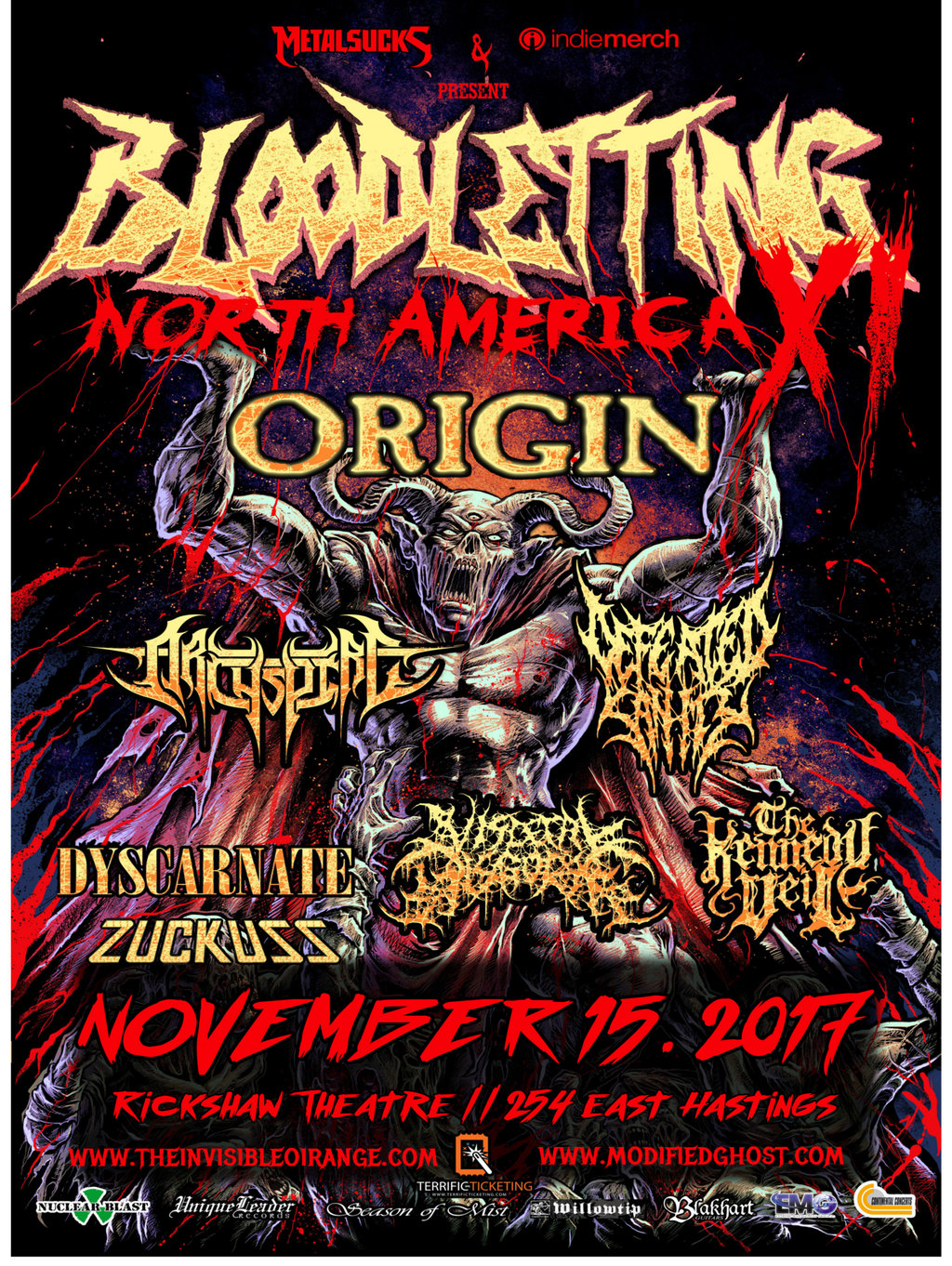 2017 marks the 11th year that the Bloodletting saga has unleashed its terror on crowds across the continent. The tour is presented by MetalSucks.net and IndieMerchstore to bring you the most devastating collaboration of artists in this realm. Tech metal aficionados Origin, genre bending Archspire and and Germany’s evil seeds Defeated Sanity have been invited as the tour’s heavy hitters. With announcements still underway for the remaining spots, there is no doubt that this will be an explosion of some the genre’s best.