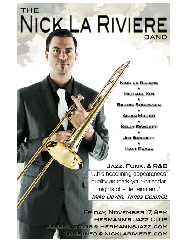 The Nick La Riviere Band is back at Hermann's! With heavy funky New Orleans influence, this band rocks the house with its big upbeat sound. Originals, covers of great artists, great solos.. This band has it all! Nick La Riviere (trombone, vocals, conch shells, wine glasses), Michael Kim (trumpet), Barrie Sorensen (sax), Kelly Fawcett (guitar), Aidan Miller (keys), Jim Bennett (bass), and Matt Pease (drums)