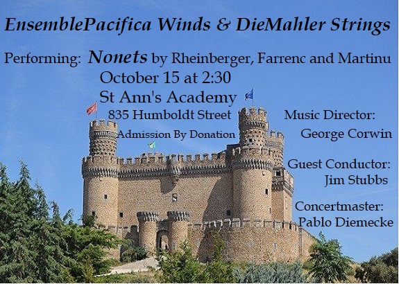 EnsemblePacifica Winds and Die Mahler Strings will combine for a performance of seldom heard Nonets from the late 18th Century. The sounds of a small chamber orchestra with the virtuosity of solo playing as they perform pleasing works from the 18th century combined with the rhythmic excitement of the Martinu Nonet.