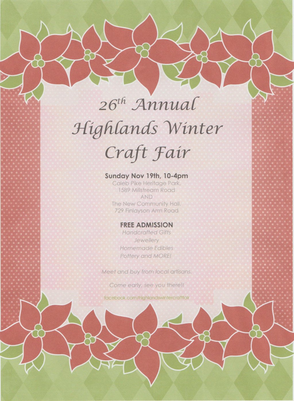 Highlands Winter Craft Fair will be held on November 19th in two sites: Caleb Pike Heritage Park 1589 Millstream Rd and Highlands Community Hall 729 Finlayson Arm Rd Free admission Handcrafted gifts pottery, homemade edibles and more.