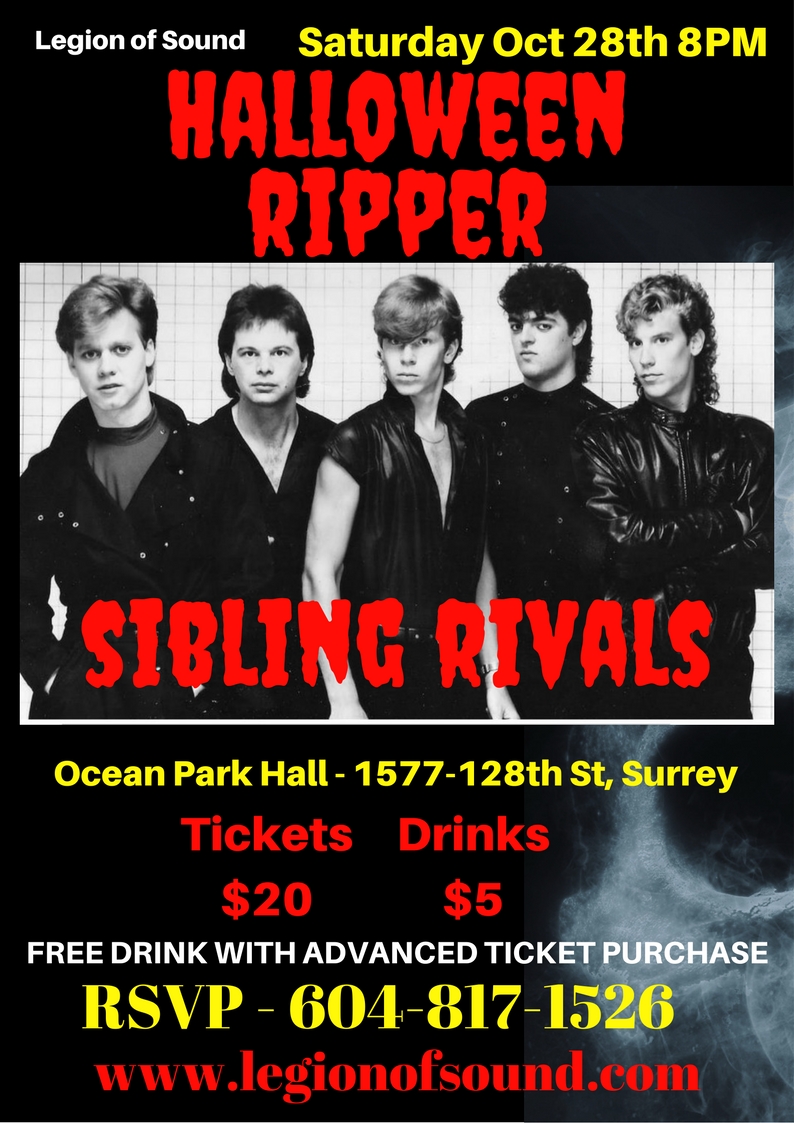 Legion of Sound is proud to present for a special Halloween Ripper one of the peninsula’s own notorious bands – The Sibling Rivals, featuring White Rock legends Jim and Rice Honeywell. They will be playing a Halloween Ripper at Ocean Park Hall on Saturday, October 28th.