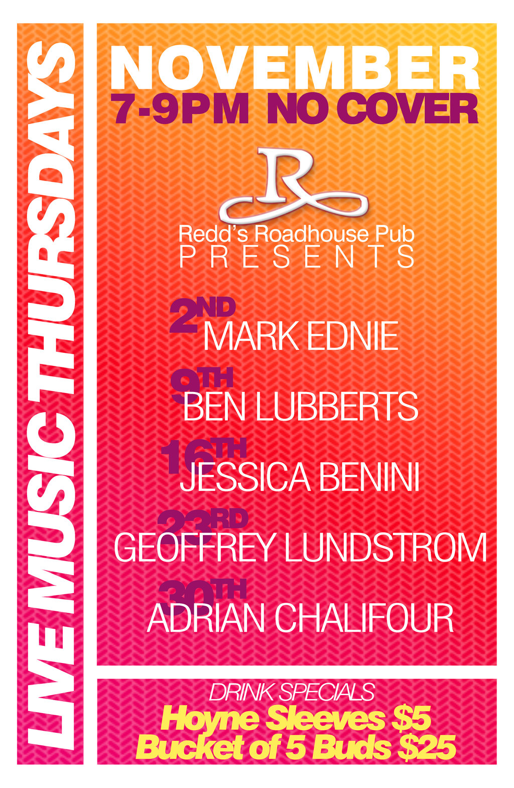 Come out to Redd's any Thursday of the week for the month of November and enjoy free live music and drink specials. This month's artists include: