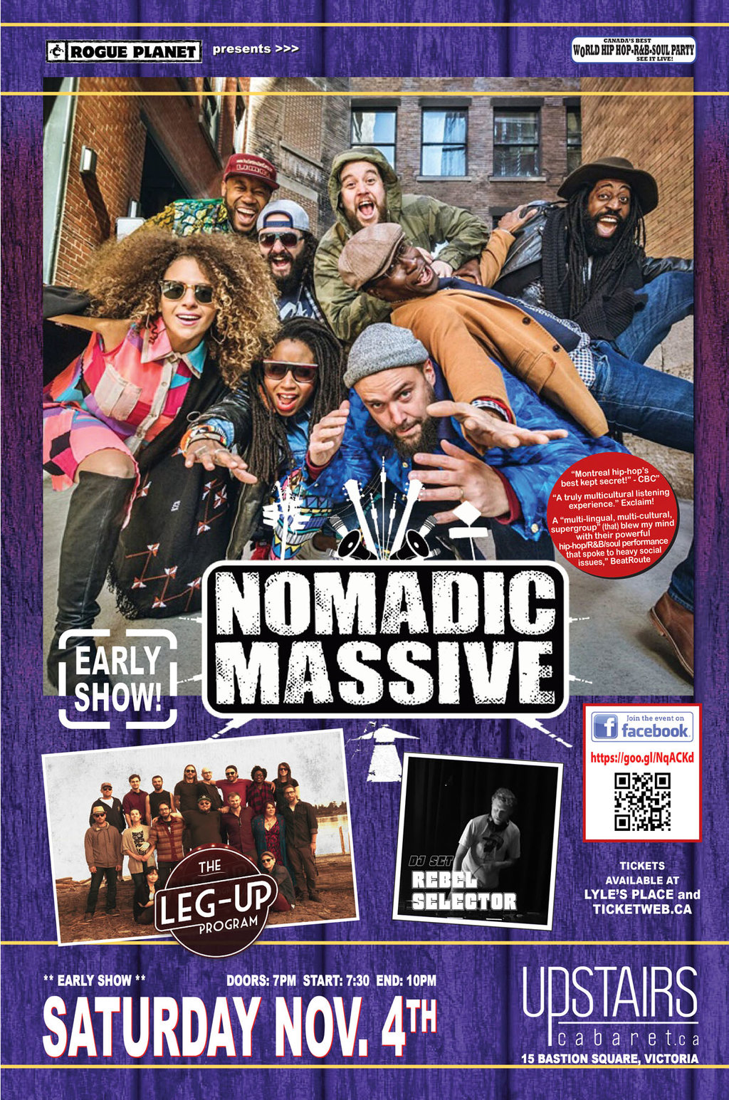 Nomadic Massive raps and sings in English, French, Creole, Spanish and Arabic. This Montreal based multilingual crew has always pushed its message past all borders. Since its inception in 2004, the collective has had the opportunity to share the stage with top notch artists all around the world, providing an action-packed show, where the crowd is an integral part of the concert.