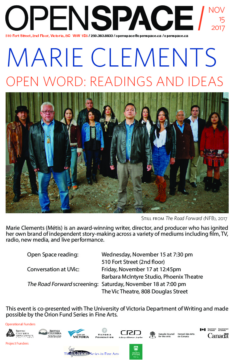 Join us Wednesday, November 15th at 7:30 pm to welcome multi-talented, multidisciplinary writer Marie Clements to Open Space as part of our Open Word: Readings and Ideas series!