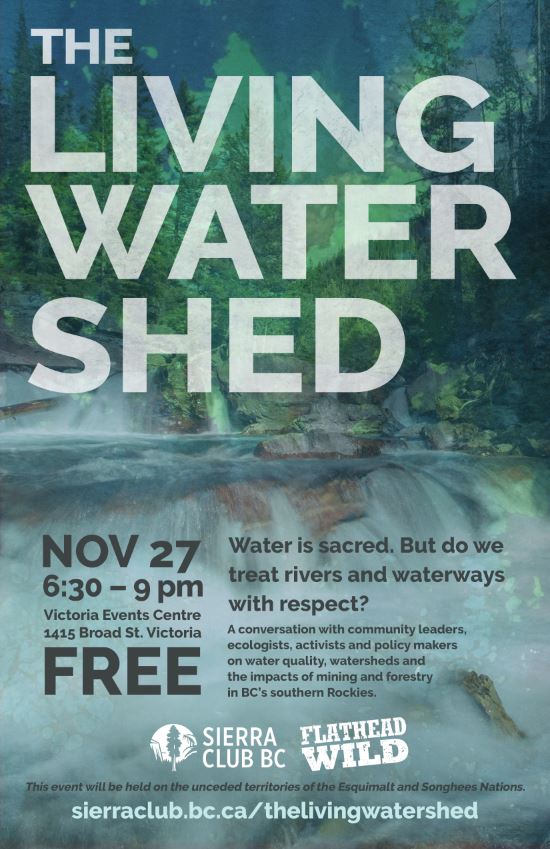 Join community leaders, ecologists, activists and policy makers in a conversation on water quality, watershed management and the impacts of mining and forestry in BC. From the Flathead to coastal rainforest ecosystems, the way we treat our water is the way we treat our future.