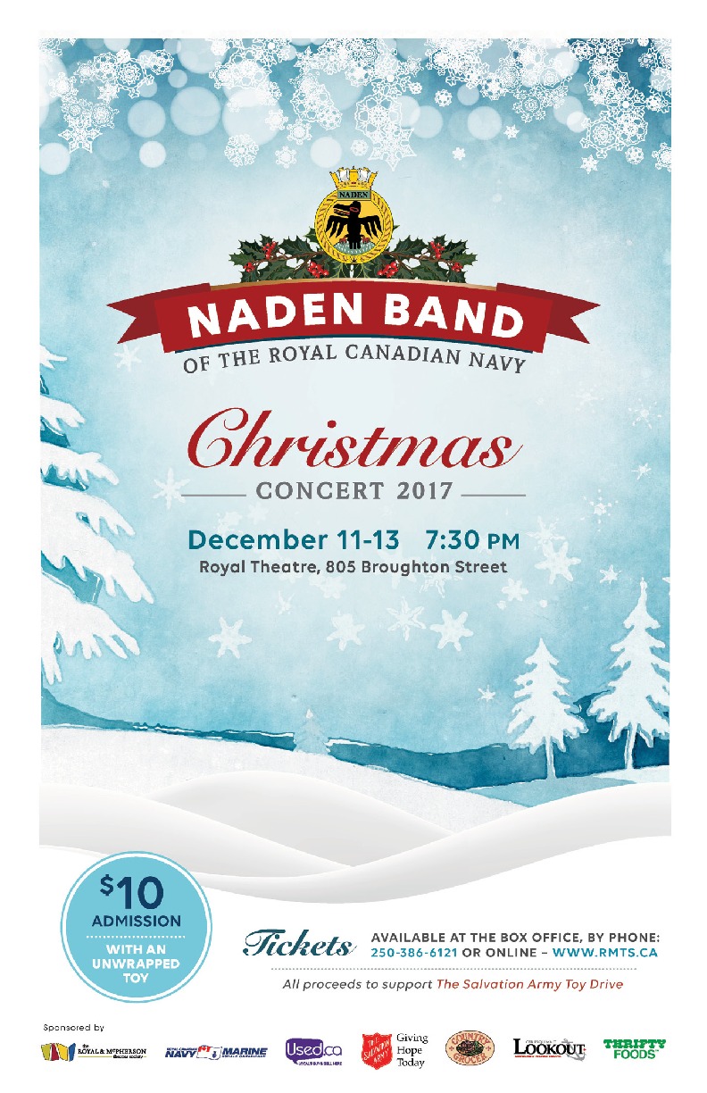The Naden Band presents their annual Christmas concerts in support of The Salvation Army Toy Drive on December 11-13, 2017 at 7:30pm at the Royal Theatre, 805 Broughton Street. Tickets are $10 each – please bring an unwrapped toy in support of the Toy Drive. Help support families in your local community who may be struggling to make ends meet!