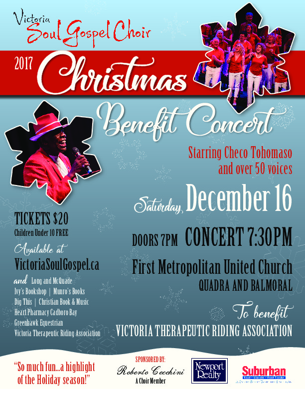 The Victoria Soul Gospel Choir's Christmas Benefit Concert is our biggest event each year. This year's concert is in support of the Victoria Therapeutic Riding Association whose mission is "to provide a therapeutic horseback riding program for children and adults with disabilities that promotes and enriches their physical, psychological and social well-being."