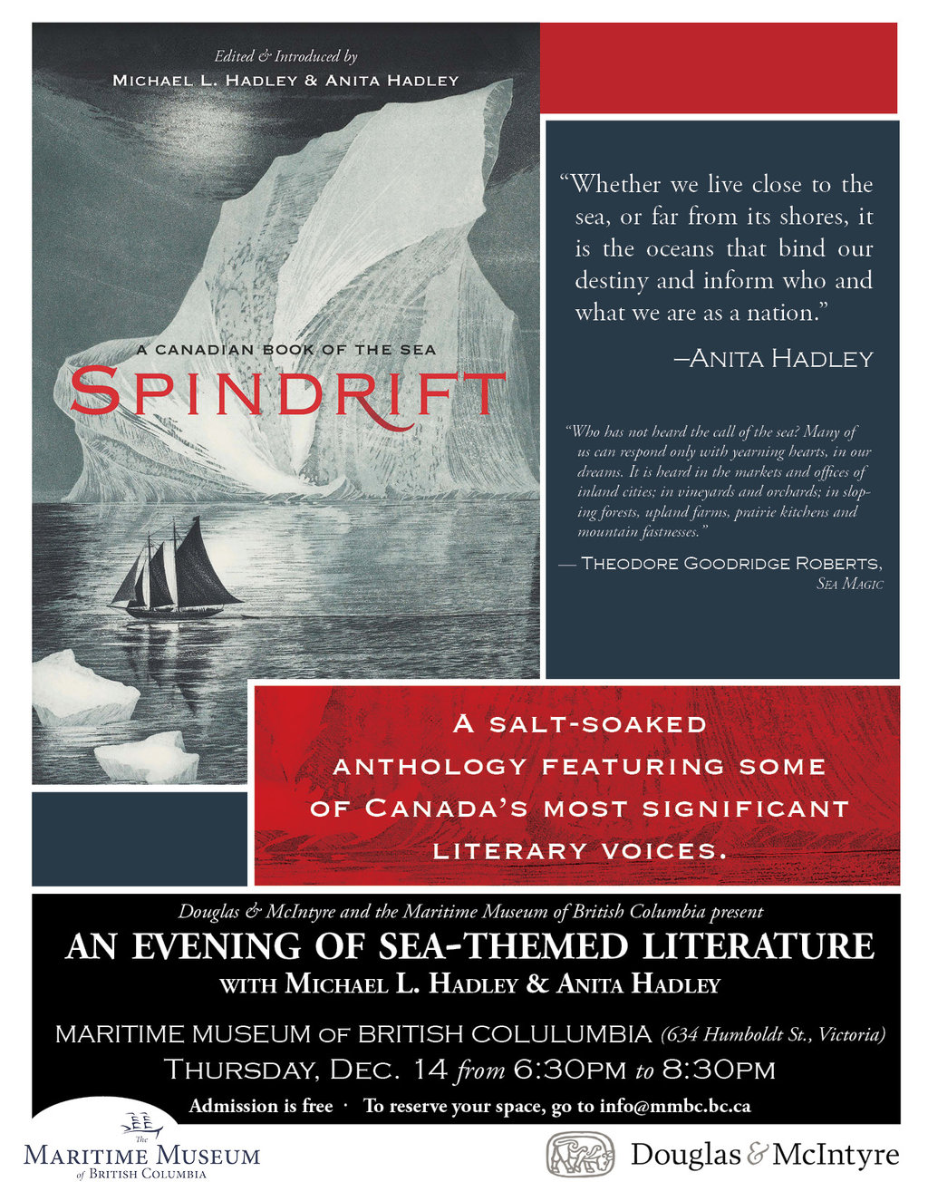 Michael and Anita Hadley, the editors of the Canadian bestseller Spindrift: A Canadian Book of the Sea, will be dipping into Canada’s literary history with an evening of readings that celebrate our maritime heritage. Refreshments and appies will be available. Seating is limited. Call the Museum at 250.385.4222 to reserve your space or email us at
