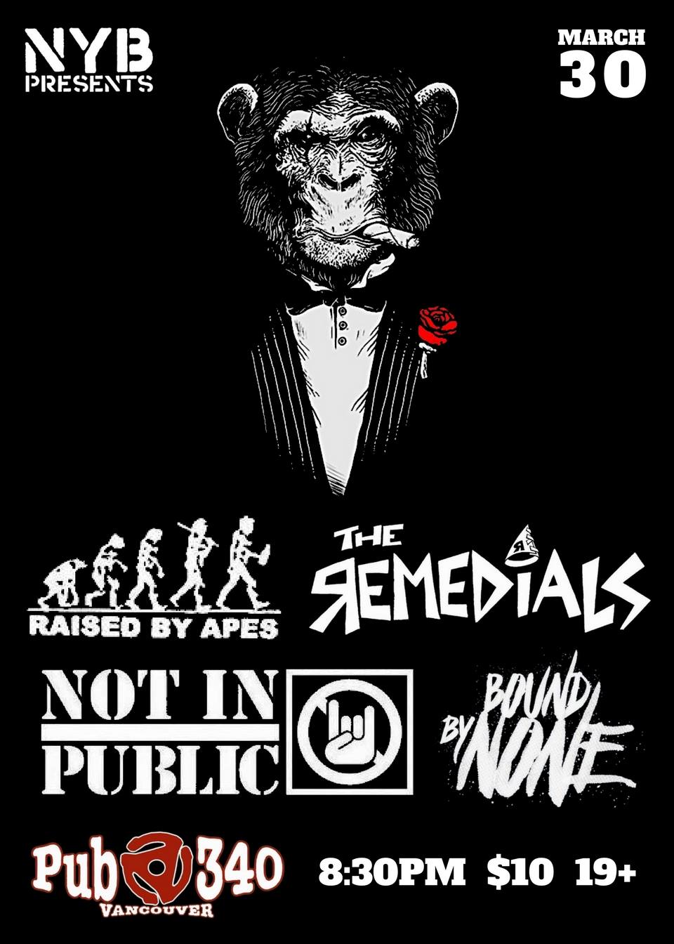 Raised By Apes, The Remedials, NOT INPUBLIC, Bound By None @ Pub 340 Mar 30 2018 - Feb 3rd @ Pub 340