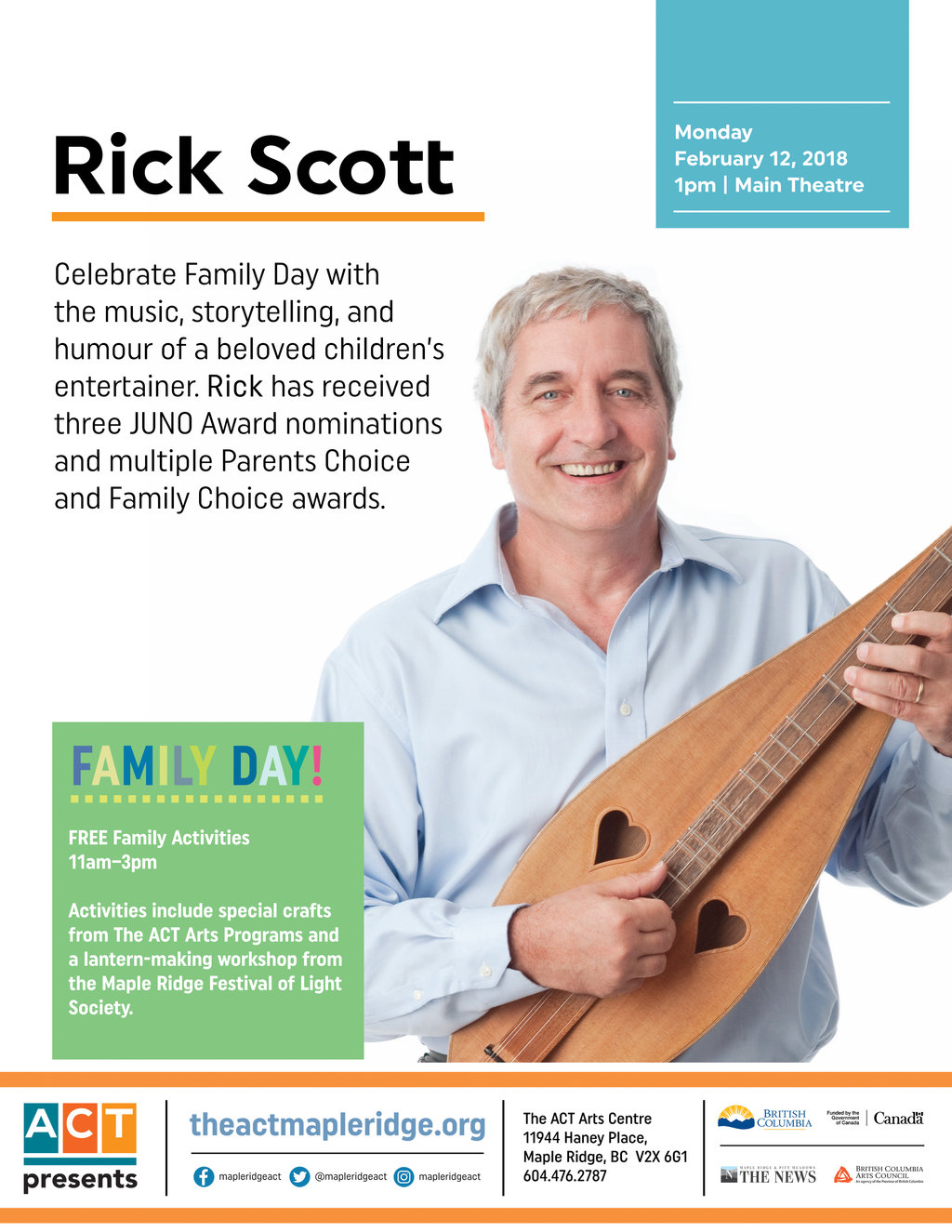 Celebrate Family Day with beloved children’s entertainer, Rick Scott. Combining music, storytelling and humour, this lively participatory concert is great for all ages.