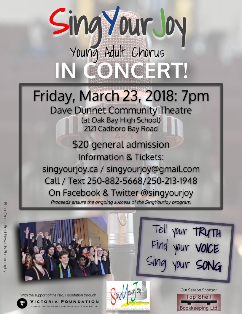 SingYourJoy has been delighting Victoria audiences with their enthusiastic choral performances for 7 years. And we are excited to perform this year's concert on the amazing stage of the Dave Dunnet Community Theatre!