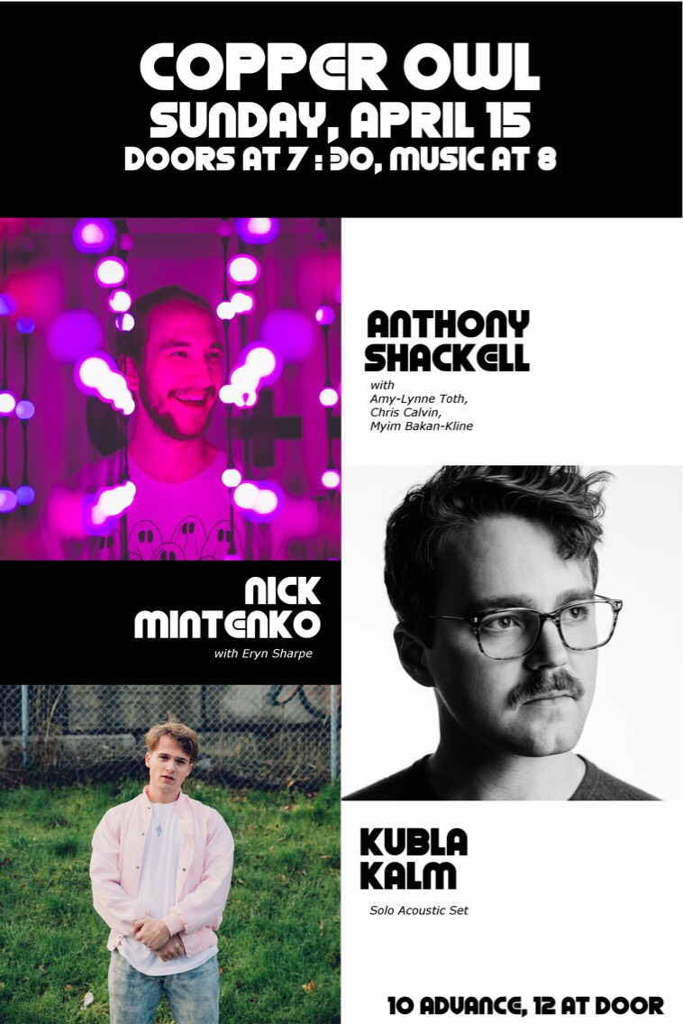 Anthony Shackell, Nick Mintenko, and Kubla Kalm team up to bring you a night of acoustic and laid back music.