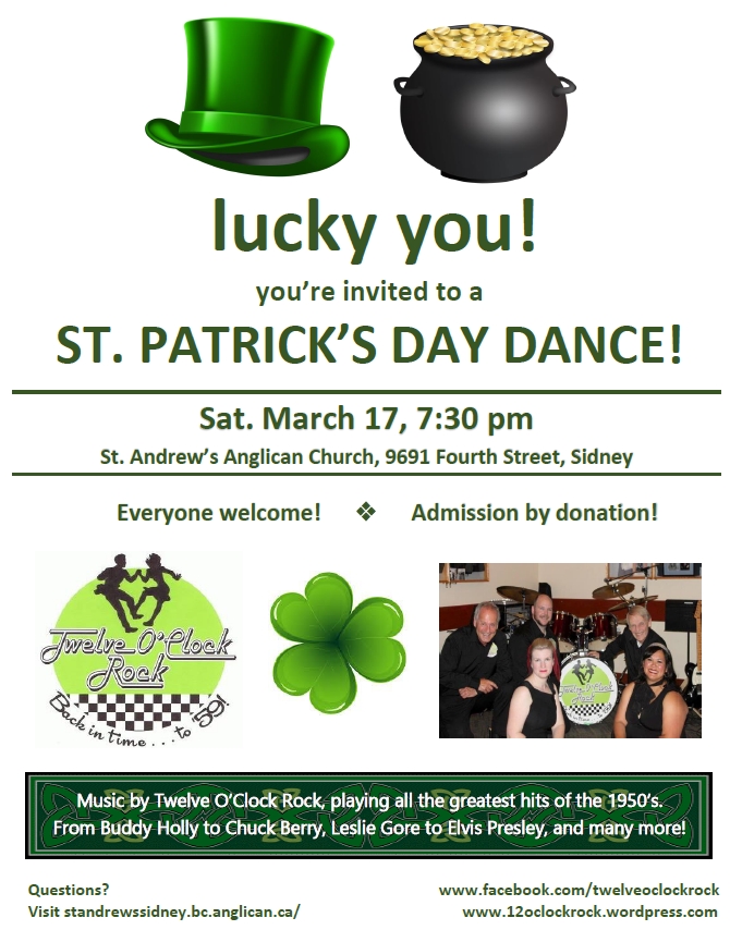 Bring the whole family to a St. Patrick's Day Dance! This Saturday night, 7:30 - 9:30 pm at St. Andrew's Hall in Sidney (at 4th and Oakville). Admission is by donation, so come dance the night away to your favourite 50's tunes!